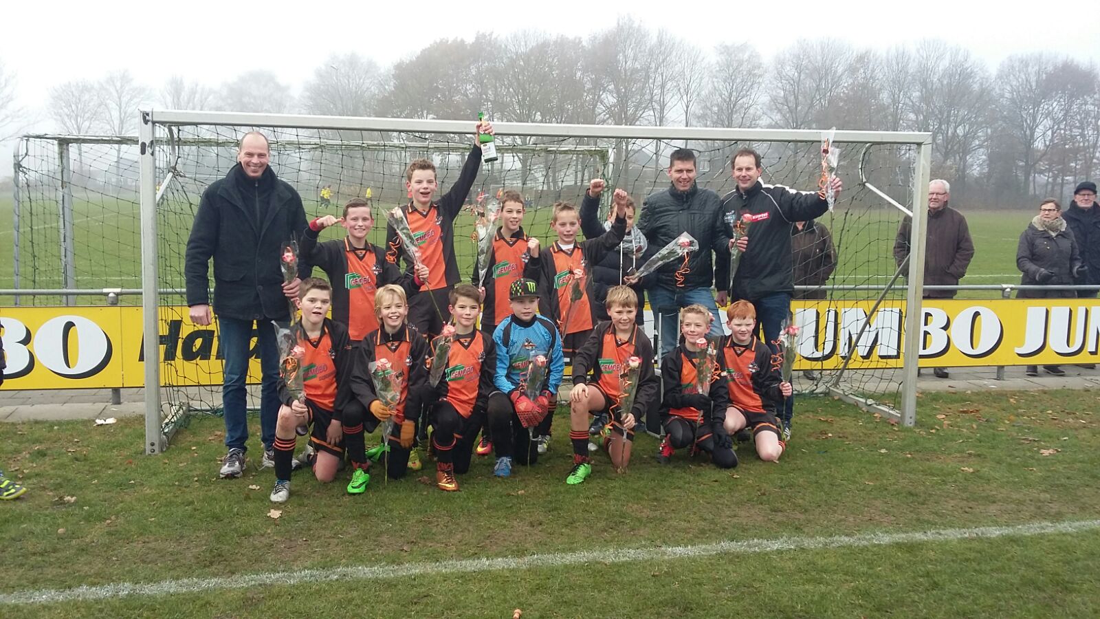 Op beide kampioensfoto’s ziet u het team bestaande uit de spelers Daniel Hendriksen, Ties Bekhuis, Thijn Paus, Thijs Olimulder, Stijn Broekman, Thijs Kole, Kasper Lohuis, Sem Zonder, Cas Kuipers, Emiel Weultjes, Bas Niemeijer en Ramon Albers. Alsmede de trainers en leiders Manfred Paus, Arjan Kole, Jan Kuipers en Marc Waaijer. Martijn Lescher (wedstrijd met Kloosterhaar 1) en Joshua Wahl (werk) konden helaas niet (de hele wedstrijd) aanwezig zijn.