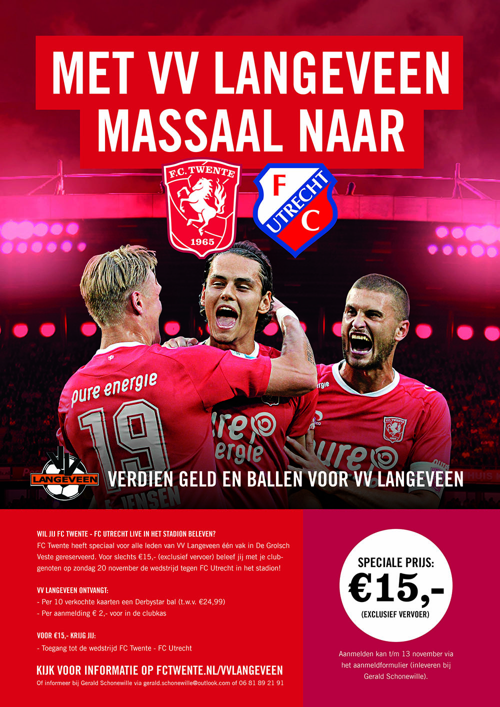 FC Twente verwelkomt bij de wedstrijd FC Twente – FC Utrecht (20-11-2016 om 14.30 uur) VV Langeveen in De Grolsch Veste. FC Twente heeft speciaal voor alle leden van VV Langeveen een vak in De Grolsch Veste gereserveerd. Voor slechts € 15,- (exclusief vervoer) beleef jij samen met je clubgenoten op zondag 20 november om 14.30 uur de wedstrijd tegen FC Utrecht in het stadion!